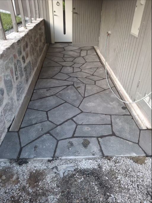 Till denna entré har vi lagt en oregelbunden skifferyta som ger ett rustikt och stilrent välkomnande. Varje sten har formats och placerats för hand för att skapa ett levande, hållbart och unikt uttryck – perfekt anpassat till husets karaktär.